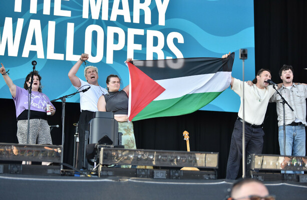 A UK festival has denied that Irish band The Mary Wallopers had their set cut off for displaying a Palestinian flag, instead claiming the act used a chant “widely understood to have a discriminatory context”.